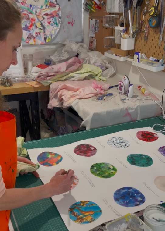 “I’ve always admired the beauty of diamonds and gemstones and have explored their colours and shapes in my painting practice for years. After finishing a painting, I would wipe my brushes and palettes on rags made from old bed sheets. One day I left a rag sitting in a shallow tub of paint water. Over time the water evaporated and the fabric absorbed the pigments and binders, creating something unexpectedly beautiful. From then on, I began letting the rags soak up the paint water instead of allowing any paint to go down the sink.